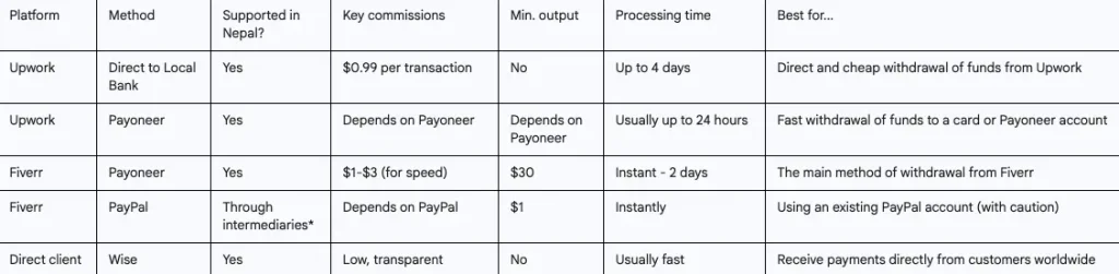 Note: PayPal withdrawal from Nepal is not officially supported. Freelancers use workarounds, such as relatives’ accounts abroad.32This method is not official and carries risks.