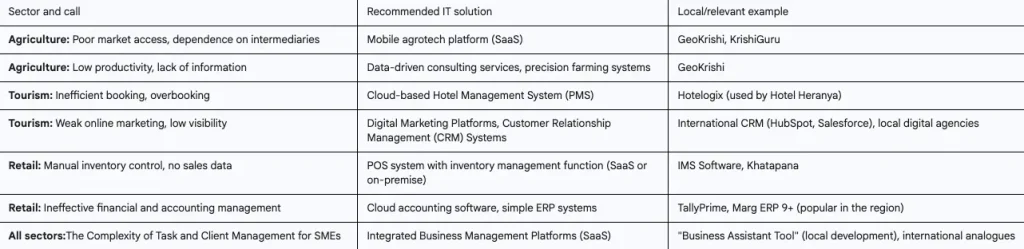 This table is the practical core of the article. It provides readers, be they hoteliers or farmers, with direct and actionable guidance. By seeing their problem listed, they can immediately identify the type of software and find a real-life example of its successful application in Nepal, making the concept of “digital transformation” tangible and achievable.