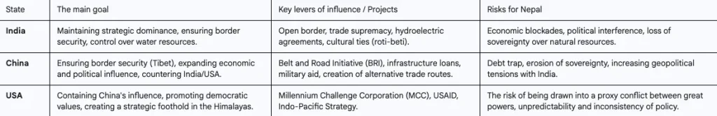 The analysis shows Nepal at the center of a geopolitical storm, where a high-stakes game is being played. India is using the levers of historical dependence to maintain its dominant position. China offers a risky but tempting alternative, promising an infrastructure revolution. The United States, meanwhile, is an unpredictable “wild card” whose actions can either strengthen or undermine the fragile balance of power.