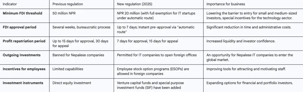 The legal basis for these changes is the Foreign Investment and Transfer of Technology Act (FITTA) Amendments 2019 and the IEBEEI Comprehensive Act 2025.8These documents introduce a number of fundamental innovations aimed at simplifying procedures and increasing the attractiveness of the Nepalese jurisdiction.