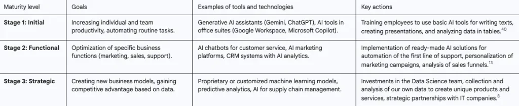 - Focus on augmentation, not just automation. The most effective approach is to use AI not to replace humans, but to augment them. For example, AI can analyze customer data and provide valuable tips to a salesperson, making their work more efficient. AI consultants can automate the first line of support, allowing human specialists to solve only the most complex problems.13