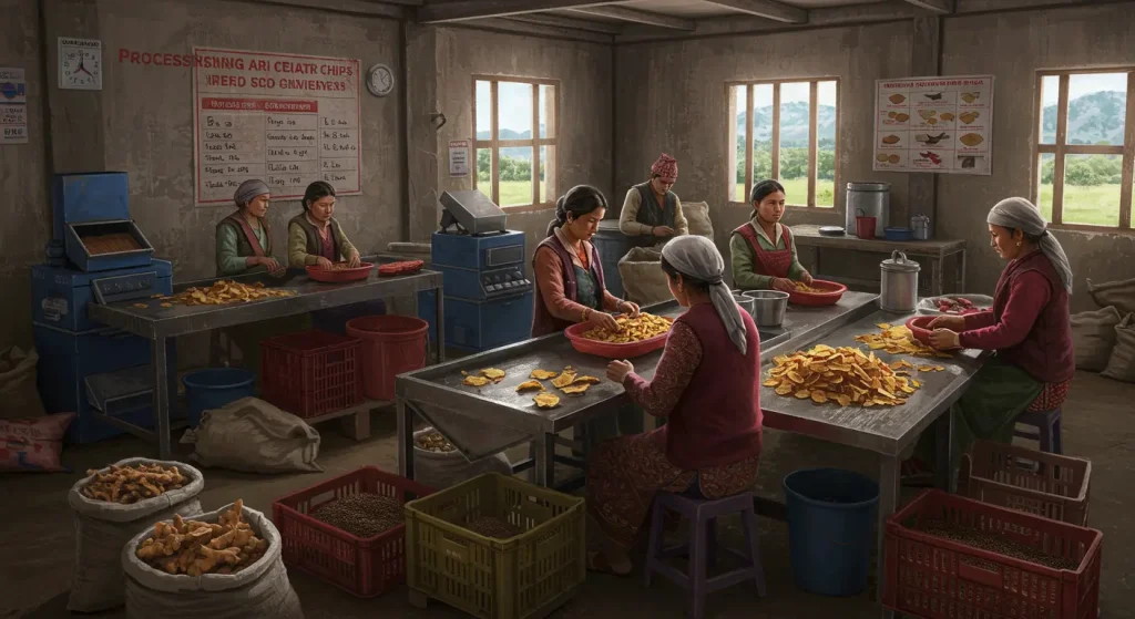 History women’s cooperative Galda Social Entrepreneurs Palpa County is a model example of such a transformation.15The cooperative unites 272 women who traditionally grew ginger and sold it raw to local markets or to Indian traders. They were entirely dependent on unstable prices and often faced monopoly from traders. The situation has changed thanks to a partnership with the international NGO Heifer Nepal.